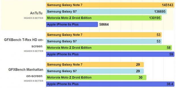 Dù có cấu hình giống như Galaxy S7 / S7 edge nhưng do tối ưu giao diện người dùng nên Galaxy Note 7 vẫn cho điểm hiệu suất rất ấn tượng.