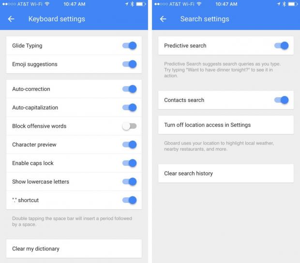 Gboard cung cấp các tùy chỉnh khác nhau, cho phép bạn có thể chỉnh theo sở thích và thói quen sử dụng của mình trong phần Cài đặt bàn phím. Ví dụ, bạn có thể cho phép truy cập vị trí để bàn phím có thể cung cấp thời tiết địa phương hoặc nhà hàng khi bạn tìm kiếm. Bạn cùng có thể kích hoạt tính năng tìm kiếm liên lạc để chia sẽ thông tin liên lạc dễ dàng hơn. Nếu như không muốn để biểu tượng cảm xúc hiển thị như dự đoán văn bản, bạn cũng có thể tắt chức năng này đi, cũng như tùy chỉnh bất cứ điều gì trên Gboard để nó làm việc như những gì bạn muốn.