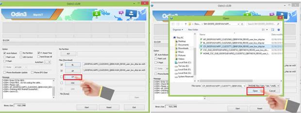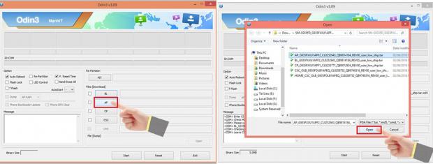 - CP > Chọn file CP_G935FXXU1APF1_CL8255771_QB9812934_REV00_user_low_ship.tar > Open.