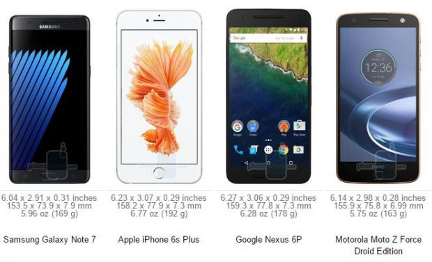 Hai sản phẩm còn lại là Nexus 6P (5,7 inch) và Motorola Moto Z Force (5,5 inch) tiếp tục không phải là đối thủ của Note7 về độ nhỏ gọn, mặc dù đây cũng là những sản phẩm cao cấp đang rất được ưa chuộng tại Mỹ.