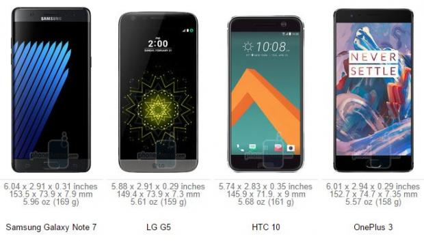Lần này bên cạnh Note7 là những siêu phẩm hàng đầu năm nay bao gồm LG G5, HTC 10 và OnePlus 3. Rõ ràng với màn hình chỉ 5,3 và 5,2 inch thì LG G5 cùng HTC 10 gọn hơn so với Note7. Tuy nhiên bạn cũng dễ dàng nhận ra chiều ngang Note7 tương đương 2 chiếc flagship này, giúp cho việc cầm máy không có gì khó khăn khi so với cả những điện thoại 5,2 inch thông thường.