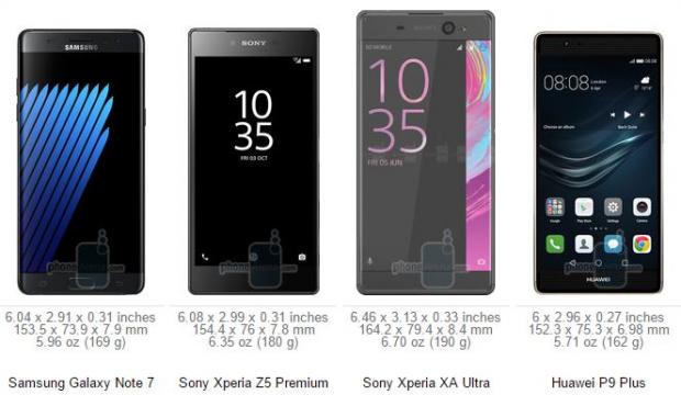 Cuối cùng, Note7 tiếp tục chứng minh thiết kế ấn tượng của họ khi đặt cạnh hai ông lớn còn lại là Sony và Huawei. Sony Xperia Z5 Premium là một chiếc điện thoại tuyệt vời, nhưng kích thước của nó vẫn nhỉnh hơn so với Note7, mặc dù Z5 Premium chỉ có màn hình 5,5 inch. Trong khi đó, một chiếc điện thoại không viền màn hình khác là Xperia XA Ultra (6 inch) cũng tỏ ra lớn hơn Note7 một cách rõ rệt. Huawei P9 Plus có kích thước tương đương Note 7 nhưng màn hình nhỏ hơn, đồng thời không hẹp bằng Note7.