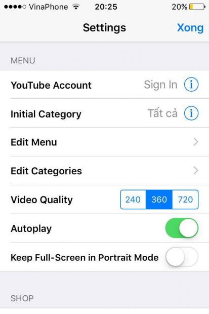 Chưa hết là chúng ta còn thiết lập được chất lượng video để tiết kiệm lưu lượng data hay để load nhanh hơn, chế độ auto play, full màn hình khi xem...
