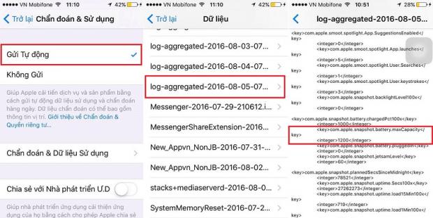 Sau khoảng 1, 2 ngày thì bạn sẽ nhận được một file chứa toàn bộ thông tin về chiếc iPhone của bạn. Để xem mức độ chai pin các bạn tiếp tục vào Cài đặt > Quyền riêng tư > Chuẩn đoán & Sử dụng > Gửi tự động > Tìm đến file log-aggregated-2016...