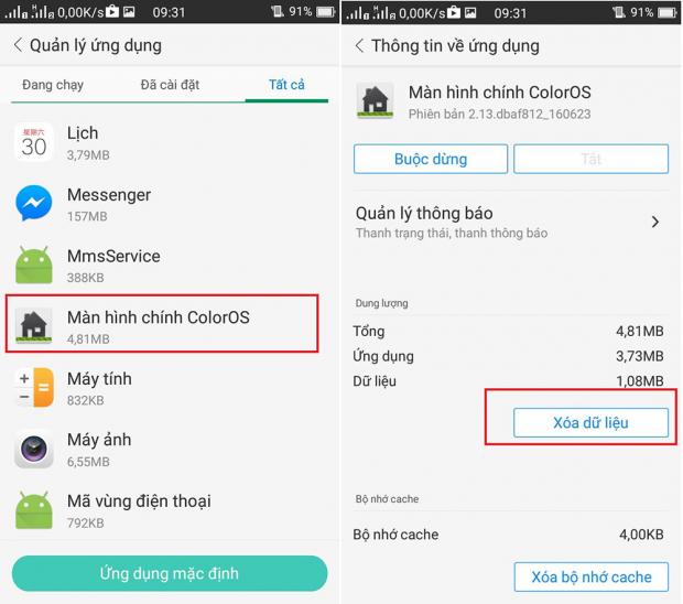 - Đầu tiên các bạn hãy xoá dữ liệu Launcher mà mình đang dùng bằng cách vào Cài đặt -> Tất cả -> Màn hình chính (hoặc tên Launcher mà bạn đang dùng) -> Xoá dữ liệu.