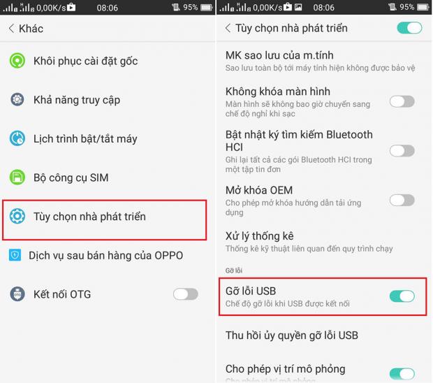 - Nếu vẫn không được thì có thể máy thiếu driver, các bạn nên bật chế độ Gỡ lỗi USB bằng cách sau: vào Cài đặt -> Giới thiệu về điện thoại > Nhấn liên tiếp khoảng 5 lần vào phần Số phiên bản > Các bạn quay ra phần Cài đặt sẽ thấy mục Tuỳ chọn nhà phát triển > Bấm vào và bật Gỡ lỗi USB lên.