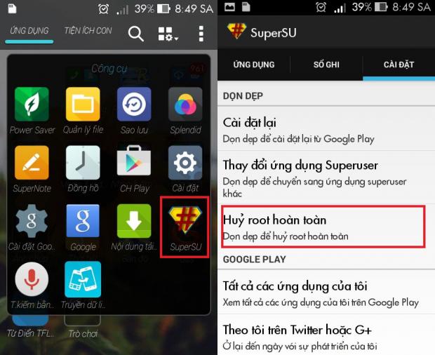 - Bạn vào phần Cài đặt > Huỷ root hoàn toàn > Khởi động lại máy là OK.