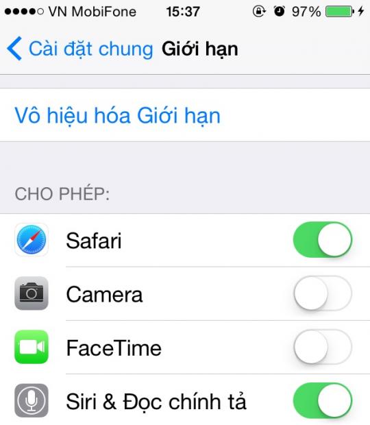 Đến đây, nếu vẫn chưa khắc phục được lỗi, có thể camera của bạn đã bị vô hiệu hóa. Bạn hãy kiểm tra bằng cách vào theo đường dẫn: Cài đặt > Cài đặt chung > Giới hạn. Tại đây, nếu thấy camera đã bị tắt đi, hãy gạt thanh trượt sang bên để bật rồi khởi động lại iPhone.