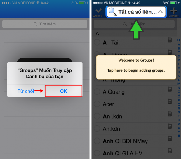 Bước 2: Sau khi cài đặt, hãy mở Groups lên, chọn OK và nhấp vào Tất cả số liên hệ