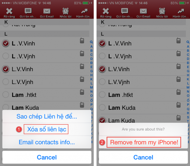 Bước 3: Tích chọn những liên lạc muốn xóa sau đó nhấp vào mục Hành động, Xóa số liên lạc và cuối cùng là Remove from my iPhone để xác nhận.