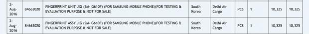 Ngoài ra, dựa vào danh sách nhập khẩu thiết bị trên Zauba cũng có thể thấy là Samsung Galaxy On7 (2016) sẽ được trang bị màn hình 4.8 inch Full-HD, camera sau 13MP và camera trước 8MP cùng 16GB bộ nhớ lưu trữ. Đặc biệt, danh sách này xuất hiện một số bộ phận được cho là cảm biến vân tay sử dụng trên On7 (2016).