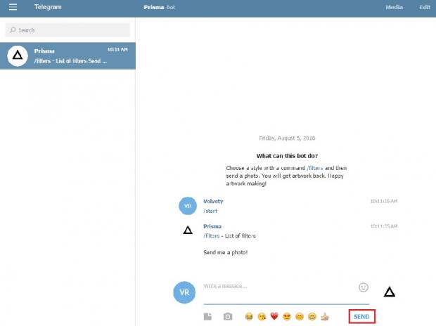 Bước 3: Bạn sẽ được AIPrismaBot gơi ý các thao tác mà bạn có thể làm. Nếu muốn xem danh sách các bộ lọc ảnh của Prisma, bạn nhập tin nhắn với nội dung “/filters” rồi nhấn SEND.