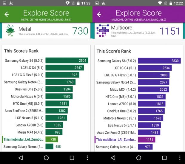 Với phần mềm Vellamo, ở phép thử Metal cho hiệu năng đơn nhân, Mobiistar LAI Zumbo J đạt 730 điểm, còn phép thử Multicore cho hiệu năng đa nhân thì sản phẩm đạt 1151 điểm. Tương tự với phần mềm Geekbench 3, Mobiistar LAI Zumbo J chỉ đạt 350 điểm trong phép thử đơn nhân và 1120 điểm trong phép thử đa nhân.