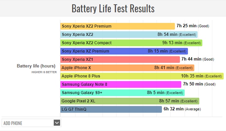 Như bạn có thể thấy, thời lượng pin của Xperia XZ2 Premium (7 giờ 25 phút) thấp hơn nhiều so với các điện thoại khác của Sony. Thậm chí, XZ2 Premium càng thất thế hơn khi so sánh thời lượng pin với điện thoại của các hãng khác như iPhone X (8 giờ 41 phút), iPhone 8 Plus (10 giờ 35 phút), Galaxy S9+ (8 giờ 5 phút), Google Pixel 2 XL (8 giờ 57 phút).