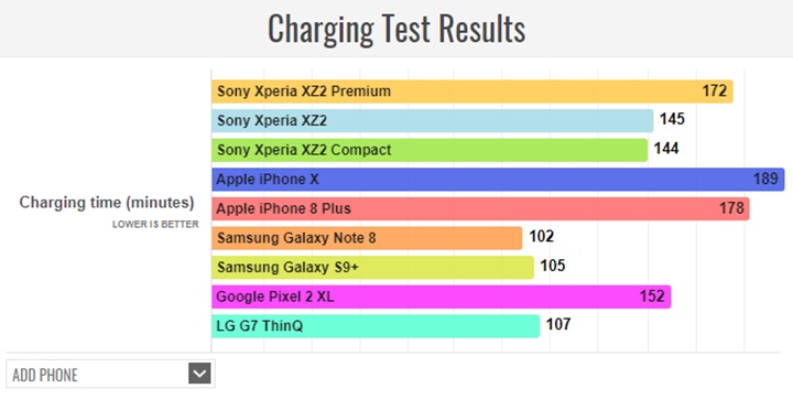 Về thời gian sạc, Xperia XZ2 Premium mất 172 phút để sạc đầy từ 0% đến 100%. Trong bài test, chỉ có iPhone X và iPhone 8 Plus là có thời gian sạc lâu hơn (với thời gian 189 phút và 178 phút tương ứng). Đa số smartphone thử nghiệm khác đều có thời gian sạc đầy nhanh hơn Xperia XZ2 Premium (bạn có thể tham khảo trên hình).