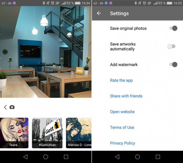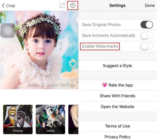 Theo mặc định, hình ảnh sau khi được chỉnh sửa xong sẽ hiển thị logo của Prisma ở góc dưới bên phải. Tuy nhiên, bạn có thể dễ dàng loại bỏ điều khó chịu này bằng cách truy cập vào menu trong mục Settings (biểu tượng bánh răng ở bên phải màn hình), sau đó vô hiệu hóa lựa chọn Add watermark (trên thiết bị Android).