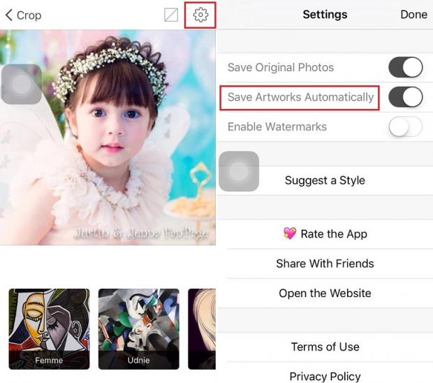 Nếu muốn chỉnh sửa nhiều hình ảnh một lúc, bạn có thể kích hoạt chế độ tự động sao lưu và khi đó những hình ảnh đã được chỉnh sửa của bạn sẽ được tự động lưu về máy và bạn có thể tìm chúng trong bộ sưu tập ảnh của điện thoại. Để làm được điều này, rất đơn giản, bạn chỉ cần vào Settings và bật chế độ lưu ảnh tự động (Save artworks automatically).