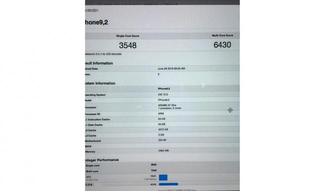 Theo đó, Geekbench ghi nhận tên thiết bị là iPhone9,2 và có thể đây là tên gọi mà Apple đặt cho các phiên bản iPhone thử nghiệm. Chiếc iPhone này chạy trên một vi xử lý lõi kép ở xung nhịp 2.37 GHz nhanh hơn một chút chip Apple A9X (2.26 GHz) trên iPad Pro và các điểm số đơn hay đa lõi cũng chỉ nhỉnh hơn một chút so với kết quả mà iPad Pro ghi nhận được trong các bài kiểm tra tương tự. Tuy nhiên, có một thông tin thú vị hơn mà chúng ta cần quan tâm đó chính là dung lượng RAM trên chiếc iPhone này là 3GB lớn hơn dung lượng RAM của mọi thế hệ iPhone trước đây (iPhone 6s là 2GB, iPhone 6 là 1GB..).