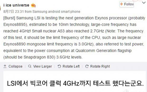 Samsung dường như đang thử nghiệm thế hệ tiếp theo của dòng chipset Exynos trên di động của mình với tên gọi là Exynos 8895. Đây có thể coi là một bước nhảy vọt lớn về công nghệ chip xử lý trên di động hiện nay. Trong khi Exynos 7420 trên Note 5 và Exynos 8890 trên Note 7 đều được sản xuất trên dây chuyền 14nmthì Exynos 8895 sẽ được xây dựng trên dây chuyền mới 10nm.