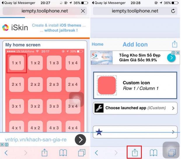 Ví dụ mình muốn để trống icon đầu tiên nên mình bấm vào biểu tượng 1x1. Thực chất của việc này là tạo ra 1 icon tàng hình xen kẽ với các icon nhìn thấy khác.