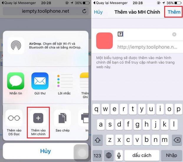 Bước 3: Sau khi bấm vào, các bạn bấm vào biểu tượng Chia sẻ > Thêm vào màn hình chính > Thêm.