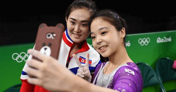 Một vận động viên Hàn Quốc (cầm điện thoại) chụp ảnh với một vận động viên Triều Tiên