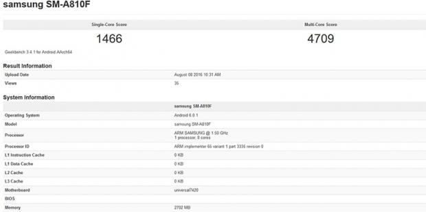 Hôm nay với sự xuất hiện qua Geekbench thì Galaxy A8 2016 lần nữa được xác nhận sẽ sử dụng chip Exynos 7420 tương tự như trên Galaxy S6 hay Note 5, khởi chạy hệ điều hành Android 6.0. Các bài kiểm tra cho thấy sức mạnh đơn nhân của Galaxy A8 mới là 1.466 điểm, khả năng xử lý đa lõi đạt 4.709 điểm.