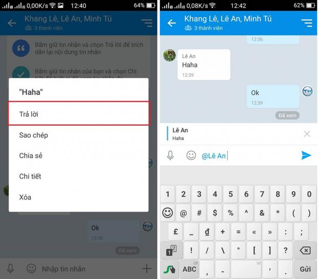 Tính năng này khá hữu ích để bạn có thể trích dẫn lại lời của người đó mà đỡ phải viết lại nội dung của đoạn đó. Để thực hiện, bạn nhấn giữ vào tin nhắn của người kia và chọn trả lời.