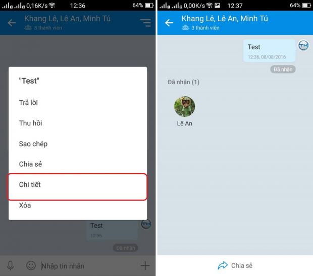 Với tính năng này, bạn sẽ biết đươc những ai đã đọc và bạn có thể nhắc lại cho những người chưa xem nó để không bỏ lỡ bất kì ai. Bạn chỉ cần nhấn giữ vào tin nhắn của mình, sau đó chọn chi tiết để biết thông tin.