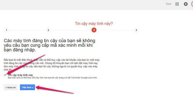 Ở bước kế tiếp, nếu đang sử dụng máy tính cá nhân và có được sự riêng tư thì bạn hãy tick vào ô “Tin cậy máy tính này”, để từ đây về sau, mỗi khi đăng nhập trên máy tính được “tin cậy”, bạn sẽ không phải mất thời gian xác minh 2 lớp nữa. Còn nếu đang dùng máy tính công cộng, máy tính ở quán internet,…thì bạn tuyệt đối không tick vào ô “tin cậy”.