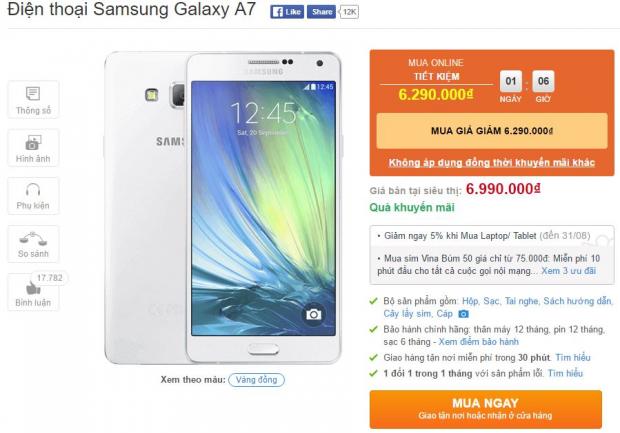 Cụ thể, khi bạn đặt mua trực tuyến Galaxy A7 2015, bạn sẽ chỉ phải trả mức giá 6.29 triệu đồng, giảm 700 ngàn đồng so với giá gốc 6.99 triệu. Dẫu vậy, thời gian áp dụng chương trình này chỉ còn hơn 1 ngày nữa thôi nhé.