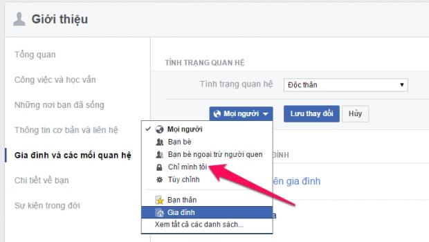 Nếu không muốn bạn bè của mình nhìn thấy các mối quan hệ cá nhân như: Hẹn hò, độc thân, mối quan hệ phức tạp,... thì bạn ẩn đi bằng cách vào: Thông tin > Gia đình và các mối quan hệ > Tuỳ chỉnh > Chọn Chỉ mình tôi.