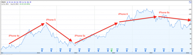 Chẳng hạn, nó đã bị mất 32 % giá trị chỉ trong vòng 1 năm (giai đoạn iPhone 5 sang 5s) song chỉ tăng nhẹ 16 % khi iPhone 6s xuất hiện. Và từ đó đến ngày nay, AAPL lại tiếp tục mất thêm 4% tổng giá trị.