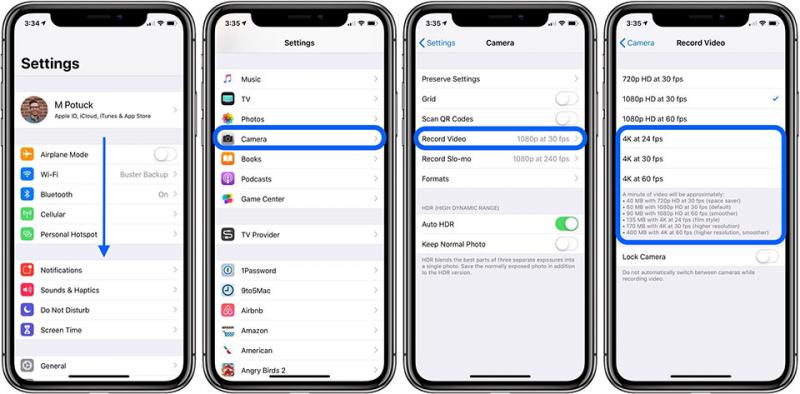 iPhone 6s và 6s Plus là thiết bị đầu tiên cung cấp 4K ở tốc độ 30 khung hình / giây. iPhone 7 và 7 Plus cung cấp tương tự, trong khi iPhone 8 / 8 Plus và iPhone X mang tới tùy chọn quay video 4K ở tốc độ 24 khung hình / giây, 30 khung hình / giây và 60 khung hình / giây. iPhone XS, XS Max và XR đều cung cấp hỗ trợ 4K giống như iPhone 8 và iPhone X. Các bước chuyển đổi sang tùy chọn quay video 4K cần thực hiện như sau: