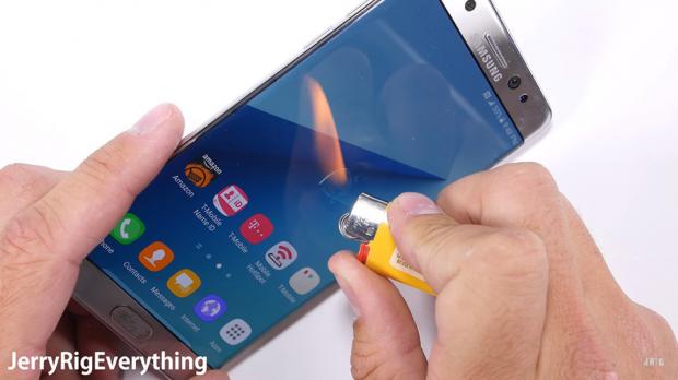 Trong phần kiểm tra bằng lửa thì Samsung Galaxy Note 7 cũng chịu đựng tốt. Màn hình gần như không có hiện tượng bị đốm đen và ít chịu ảnh hưởng. Còn trong phần bẻ cong cuối cùng thì smartphone của Samsung đã xuất sắc vượt thử thách mặc dù có thể thấy rằng lực tác động mà tác giả gây nên rất mạnh nhưng điện thoại không hề hấn gì. Điều này cũng cho thấy rằng kính Gorilla Glass 5 cùng bộ khung kim loại chắc chắn đã giúp Note 7 rất cứng cáp và bền bỉ.