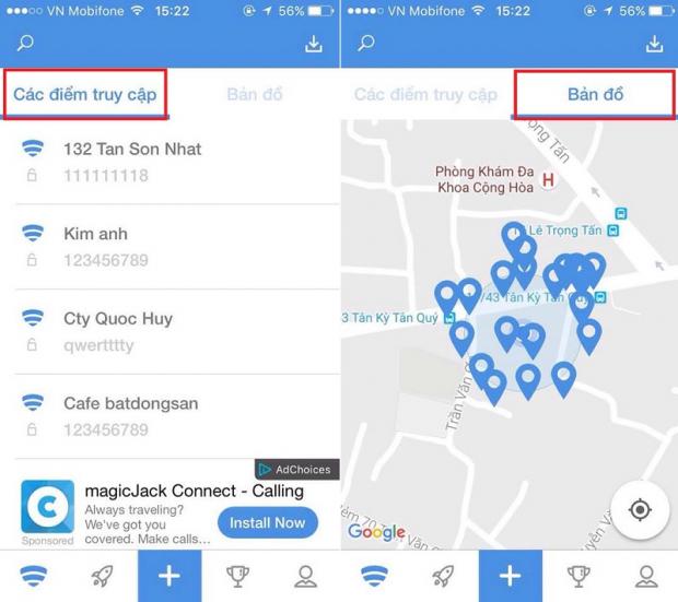 Mở ứng dụng lên, các bạn sẽ thấy giao diện ứng dụng có 2 mục chính: Các điểm truy cập và Bản đồ những điểm wifi xung quanh bạn dựa vào vị trí.