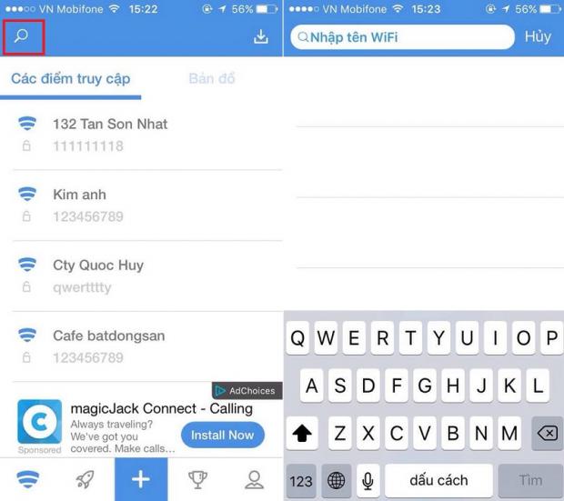 Ngoài ra bạn cũng có thể bấm vào nút tìm kiếm để dò một pass wifi cụ thể.