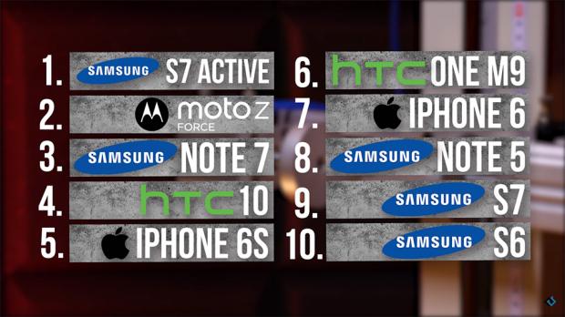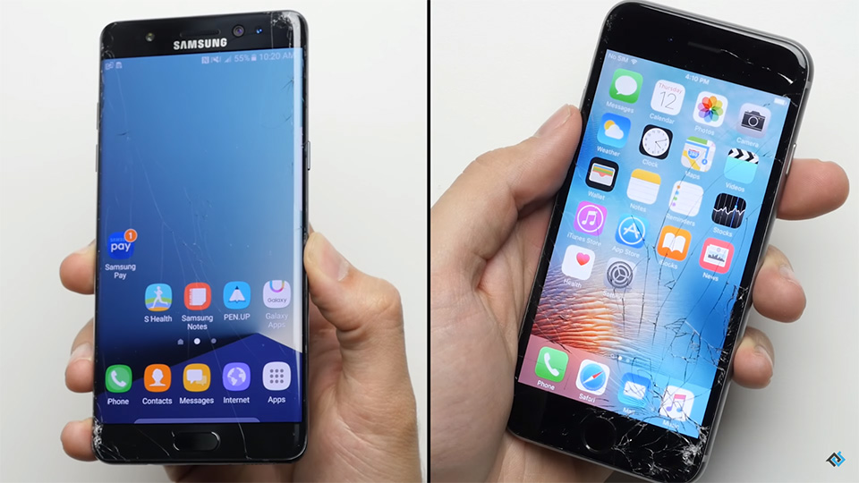 Kết quả thì cả 2 điện thoại đều bị ảnh hưởng sau va chạm nhưng trên Galaxy Note 7 thì màn hình ít bị ảnh hưởng hơn và rõ ràng có thể thấy Gorilla Glass 5 đã tạo ra sự khác biệt. Galaxy Note 7 chỉ bị một vết nứt nhỏ trên dưới bên trái của điện thoại trong khi IPhone 6s đã có xuất hiện nhiều vết nứt khắp màn hình.