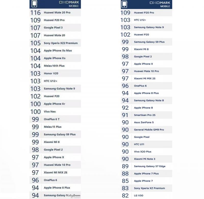 Kế đến là bộ đôi iPhone XS/ XS Max, do chỉ nâng cấp nhẹ ở phần cứng và phần mềm nên bộ đôi này đồng hạng 6 và có được 104 điểm, thấp hơn 1 điểm so với model Xperia XZ2 Premium của Sony. Đây cũng là một trong những lần hiếm hoi một thiết bị đến từ Sony được góp mặt trong top 5. Ngoài ra, vì bị cắt giảm 1 camera tele, chiếc iPhone XR chỉ có được 100 điểm.