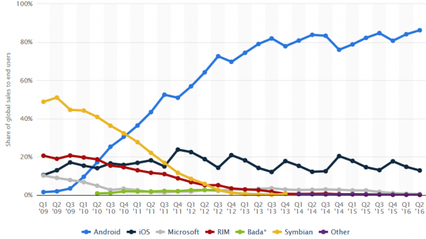 Cụ thể trong quý 2 năm 2016, đã có đến gần 297 triệu smartphone Android bán ra, số iPhone đến tay người dùng đạt 44.4 triệu sản phẩm, Windows Phone khiêm tốn với 1.97 triệu thiết bị, sản phẩm chạy hệ điều hành BlackBerry gần như chỉ góp vui với 400.000 smartphone.