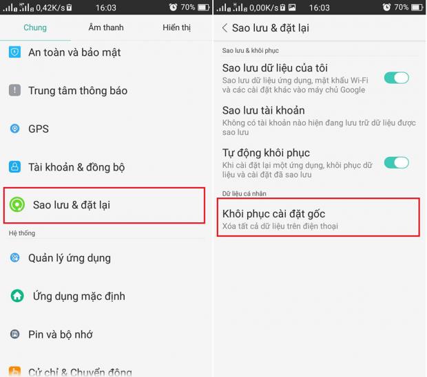 Bạn vào Cài đặt > Sao lưu và đặt lại. Tại đây bạn chọn Khôi phục Cài đặt gốc.