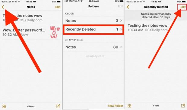 - Mở ứng dụng Ghi chú lên, chọn vào dấu mũi tên bên góc trái. Tiếp đến, chọn mục Recenty Deleted (Đã xoá gần đây) và nhấn vào Edit.