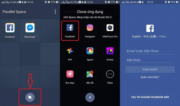 Bạn có thể đăng nhập và dễ dàng chuyển qua lại giữa nhiều tài khoản với nhau thông qua ứng dụng Parallel Space. Đầu tiên, bạn mở ứng dụng lên và chọn vào nút bên dưới. Sau đó, chọn vào ứng dụng mà bạn muốn để đăng nhập.