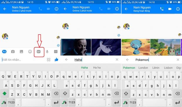 Khi bạn chat với bạn bè trên Facebook, bạn có thể biến cuộc nói chuyện trở nên sinh động hơn bằng cách gửi ảnh Gif chứa nội dung mà bạn muốn. Ở khung chat, bạn nhấn vào mục Gif. Sau đó bạn nhập những từ khoá như haha, hihi,... Facebook sẽ tìm những ảnh tương ứng để bạn có thê chọn và gửi cho bạn bè.