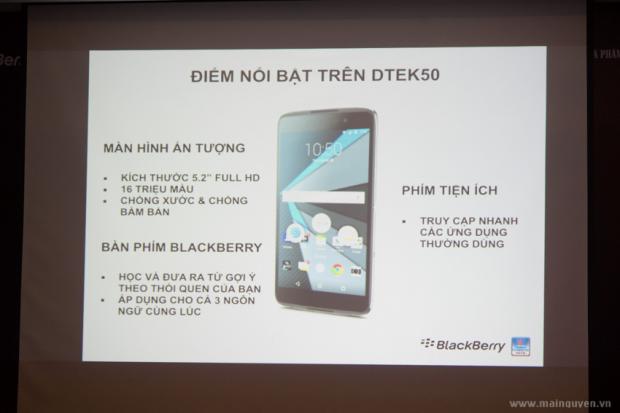 Điểm nhấn lớn nhất của sản phẩm này đã được thể hiện từ cái tên DTEK50 của máy, Dtek là tên phần mềm bảo mật tốt nhất của BlackBerry hoạt động trên nền Android và BlackBerryOS. Ứng dụng này sẽ tạo ra những lớp bảo mật khác nhau, cũng như sự an toàn trong việc sử dụng các ứng dụng hằng ngày. Dtek sẽ kiểm soát mọi mệnh lệnh được đưa ra từ ứng dụng của bên thứ 3, qua đó, kiểm soát hoàn toàn các thiết lập điều khiên và bảo mật thông tin người dùng tốt hơn. Ngay bây giờ, khách hàng mua máy tại Mai Nguyên sẽ nhận ngay 2 món quà rất hấp dẫn là: