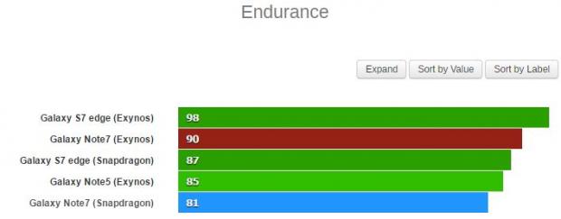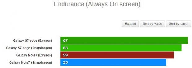 Trong thử nghiệm với chỉ duy nhất tính năng Always On Screen, Galaxy Note 7 chip Exynos đạt 59 giờ, Note 7 chip Snapdragon 820 đạt 55 giờ, thấp hơn so với Galaxy S7 Edge.