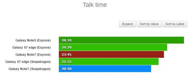 Ở thời gian nghe gọi, Note 7 dùng chip Exynos cũng đạt thời lượng dài hơn với 23 giờ 45 phút, trong khi Note 7 chip Snapdragon chỉ là 20 giờ 48 phút.