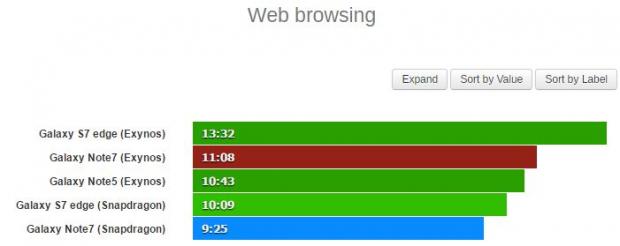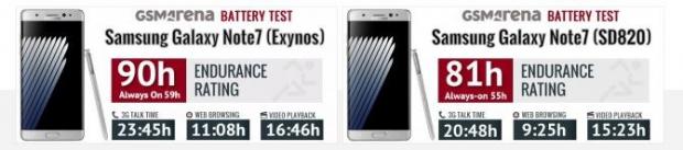 Ở thử nghiệm duyệt web, Galaxy Note 7 chip Exynos đạt thời gian 11 giờ 08 phút, trong khi Note 7 chip Snapdragon chỉ đạt 9 giờ 25 phút.