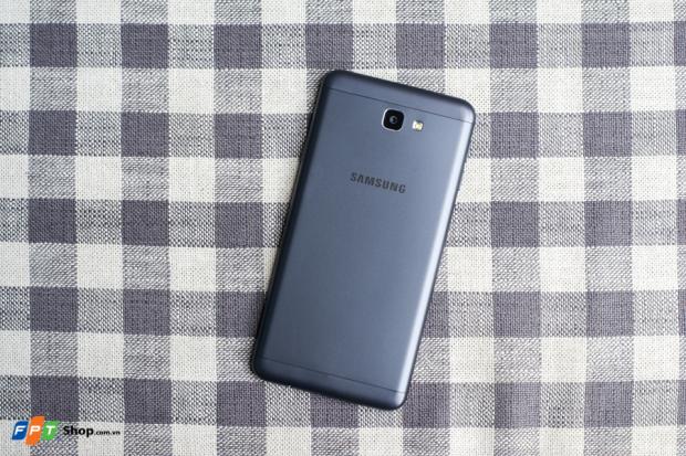 Mặt lưng của Samsung Galaxy J7 Prime được thiết kế dạng 3 mảng tách biệt. Trong đó, chúng ta có camera 13MP khẩu độ f/1.9 với đèn flash LED và logo truyền thống của hãng Samsung được đặt ở giữa.