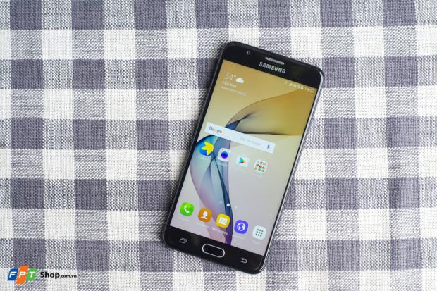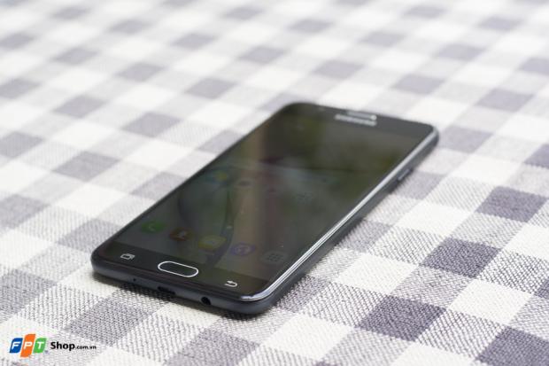 Ở mặt trước, ta có màn hình 5,5 inch độ phân giải Full HD (1920 x 1080 pixel) sử dụng công nghệ tấm nền TFT với mặt kính cường lực cong 2,5D ôm sát thân máy. Việc sử dụng mặt kính cong 2,5D ngoài yếu tố thẩm mỹ cao thì còn mang đến trải nghiệm vuốt từ các cạnh vào mượt mà, không bị cấn tay như một số thiết bị sử dụng mặt kính phẳng. Màn hình của điện thoại Samsung Galaxy J7 Prime sử dụng công nghệ tấm nền TFT nên nhìn chung màu sắc thể hiện không được tươi tắn mà có phần hơi bị nhợt nhạt.